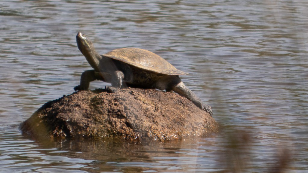 The Murray River Turtle is common in the wetlands and billabongs close to the Murray River. This one found a large rock to bask on Lake King, note the broad shell about the size of a dinner plate. Turtle Link