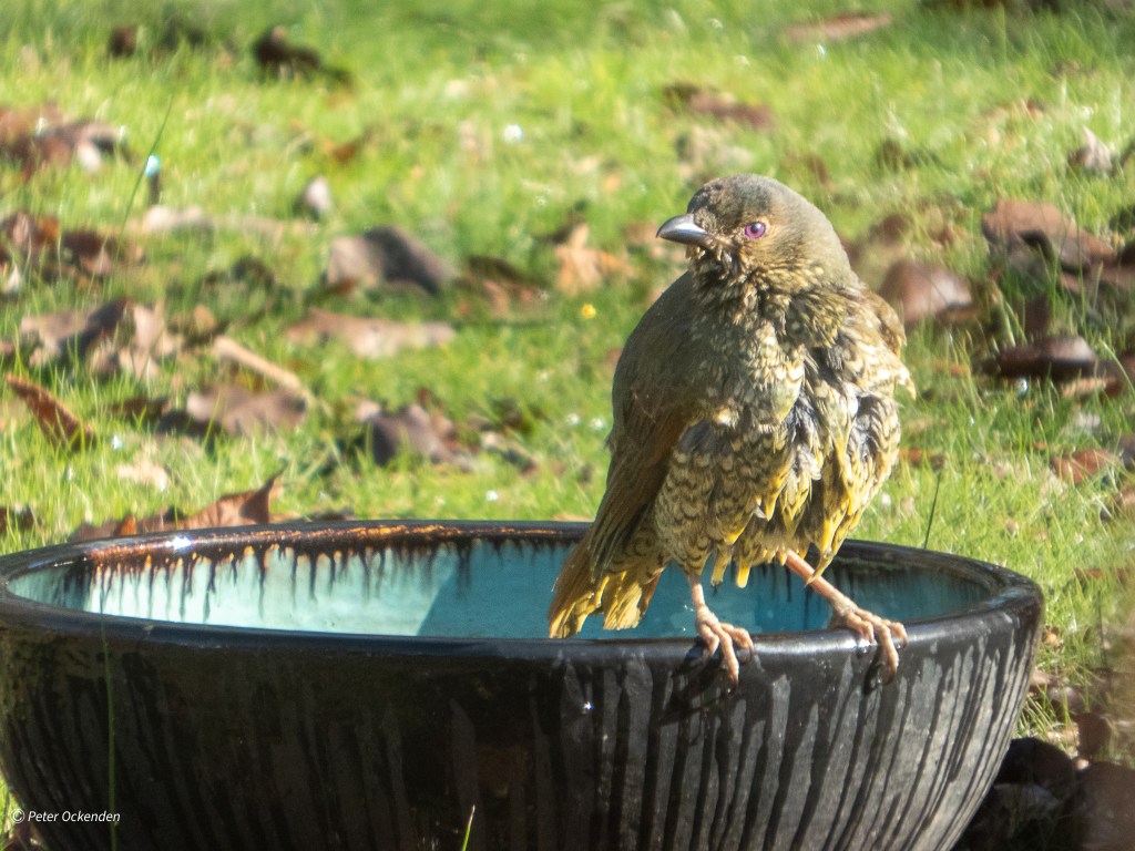 This Satin Bowerbird above had just departed the water bowl setting itself up in our Ornamental Pear tree above it. Difficult to tell if it is a male or female at this stage as the male does’nt develop the deep blue until it’s fully mature.